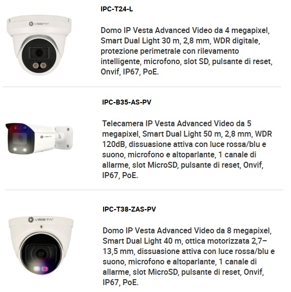 Le telecamere VESTA Advanced Video Series semplificano l’integrazione tra videosorveglianza e sistemi di intrusione, offrendo un reale valore aggiunto a ogni installazione. Grazie alla loro analitica IVS intelligente, il professionista può attivare funzioni avanzate come la rilevazione di attraversamento linea o intrusione in area in pochi secondi, senza la necessità di configurazioni complesse o software aggiuntivo. Una soluzione completa per ottimizzare la rilevazione, ridurre i falsi allarmi e rendere ogni progetto di sicurezza più professionale.