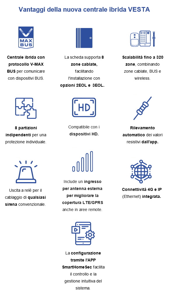 Il vero best seller, ampiamente collaudato sul mercato. Offre connettività 4G LTE, fino a 320 zone e domotica avanzata per una protezione completa e una totale tranquillità.