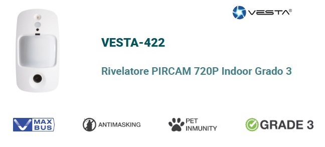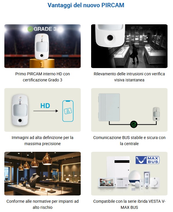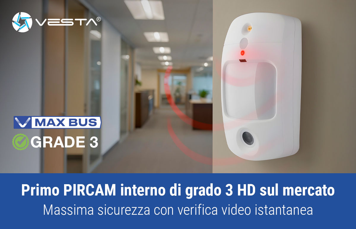 Presentiamo la prima PIRCAM da interno Grado 3 HD V-MAX BUS di VESTA : una soluzione pionieristica per progetti di sicurezza ad alto rischio che richiedono la massima affidabilità. Questo dispositivo combina rilevamento di intrusione con verifica visiva in alta definizione, rispettando i requisiti di Grado 3 per installazioni critiche. La sua tecnologia BUS garantisce una comunicazione stabile, rapida e sicura con la centrale ibrida VESTA, offrendo un valore aggiunto a integratori, installatori e CRA.