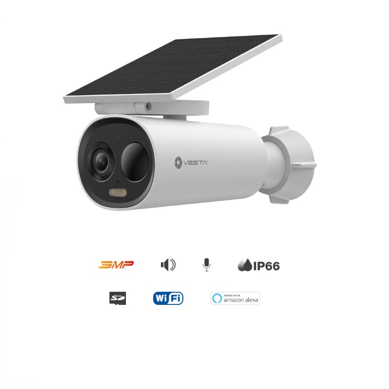 Bullet WiFi IP VESTA Solar Cell, 3MP@15ips, H.265, IR 15 metri, Ottica fissa da 2,8 mm, Sensore video e rilevamento persone PIR, Modalità privacy, Deterrente attivo, Microfono e altoparlante, Slot MicroSD, RJ45, Batteria ricaricabile da 5000 mAh, Include un pannello solare, Notifiche di batteria scarica, Protezione IP66, Compatibile con Amazon Alexa