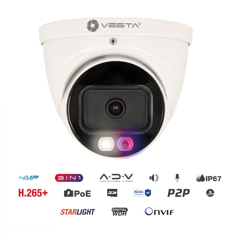 Dome IP Vesta Advanced Video, 4MP@25/30ips, H.265+, 0,006 lux, Smart Dual Light 40m, Ottica motorizzata da 2,7 a 13,5mm, WDR digitale, 3D-NR, Protezione perimetrale e rilevamento intelligente del movimento, Deterrenza attiva, Microfono e altoparlante integrati, Slot MicroSD, pulsante di reset, RJ45, Onvif, IP67, PoE.