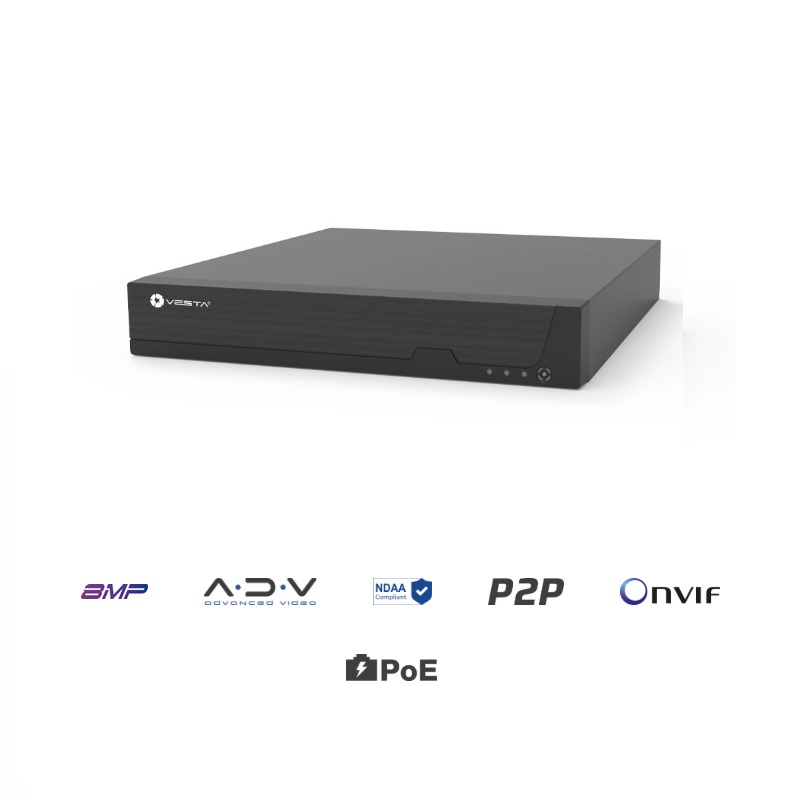 NVR IP Vesta Advanced Video Serie Entry a 16 canali, Ingresso/uscita H.265/H.264, 138/138 Mbps, Uscite simultanee HDMI (4K) e VGA (1080P), AI da telecamere: protezione perimetrale, rilevamento volti, conteggio persone e SMD, 1 capacità HDD SATA, 1 RJ45 Fast Ethernet, 2 USB 2.0, 12V DC, 8 PoE
