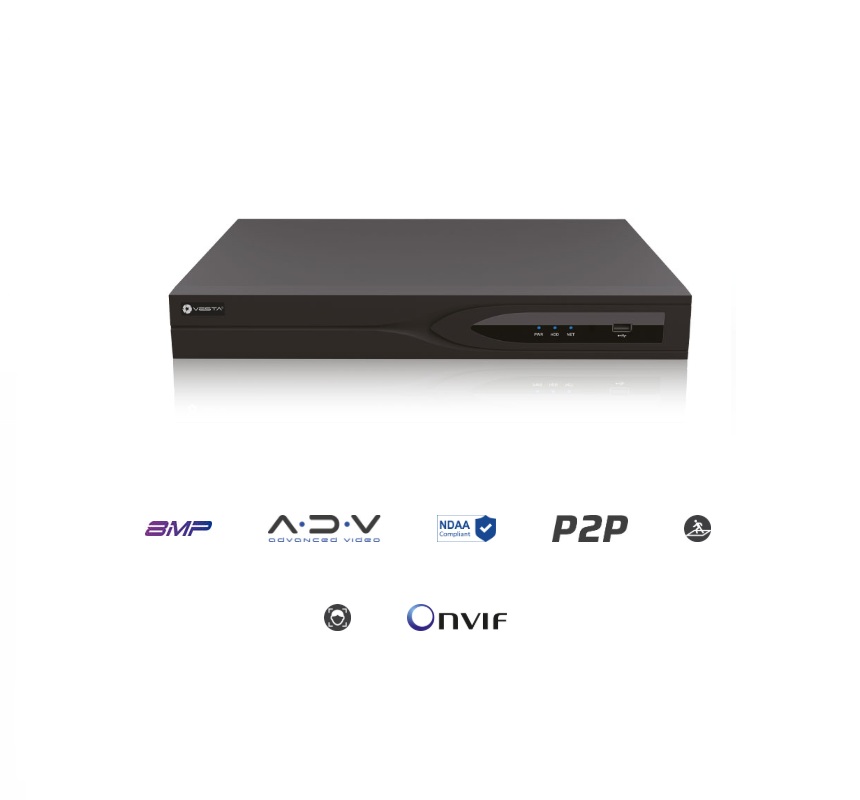 NVR IP Vesta Advanced Video Pro Serie AI-L a 16 canali, Ingresso/uscita H.265/H.264, 256/256 Mbps, Uscite simultanee HDMI (4K) e VGA (1080P), AI dalle telecamere: protezione perimetrale, rilevamento volti, conteggio persone e SMD, AI da NVR: protezione perimetrale, rilevamento dei volti e SMD, 2 HDD SATA, 1 RJ45 Gigabit, 2 USB 2.0, 1 USB 3.0, 12V DC