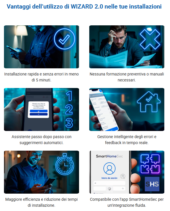 Il vantaggio principale del WIZARD è che le aziende possono iniziare a utilizzare VESTA senza bisogno di formazione o corsi specifici. Questo non solo permette di risparmiare tempo e risorse, ma riduce al minimo gli errori di configurazione, garantendo una protezione estremamente affidabile e versatile per abitazioni e aziende. Cerchi efficienza? Vuoi la migliore tecnologia senza complicazioni? Con VESTA e WIZARD, bastano solo 5 minuti per completare un’installazione impeccabile.